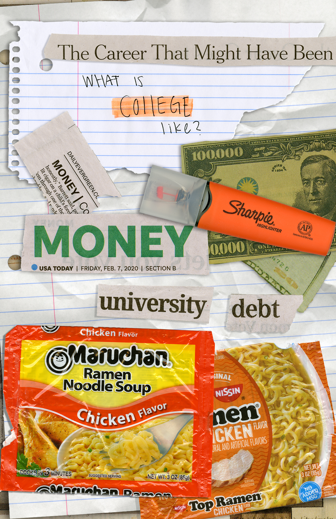 For my comic I chose to put items together in which were parts of my college experience so far. I believe my collage comic fits into Scott McCloud’s description of what a comic is because though my work I am telling a story of how my life at college has been. One inspiration I used for my project was Linda Barry. I thought her work with lined legal paper was stunning. However, to fit my theme more properly I scanned a piece of spiral notebook paper that I had ripped and crumpled up. Crumpling up the paper gives it a 3D aspect and is visually more interesting. In addition to this piece of paper I added layers of newspaper clippings on top in photoshop. The placement of these papers put my comic in linguistic mode. However I kept visual mode as well when I placed them as if you read them like a normal page, left to right and top to bottom. I even put another layer with a different clipping that repeated the use of the word “money” to emphasize it.