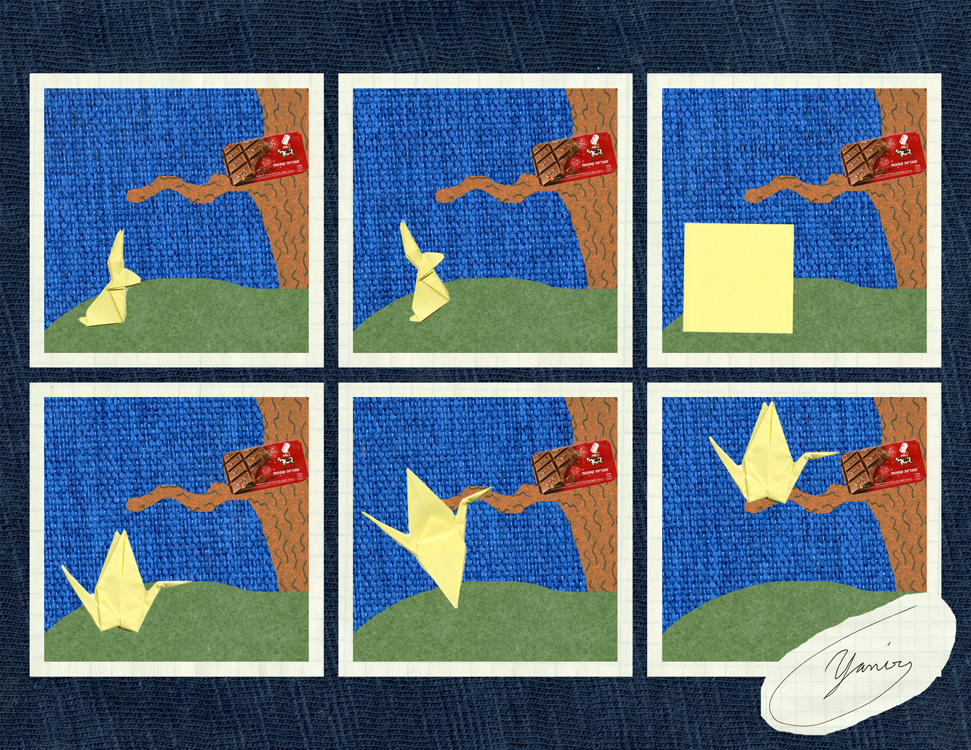 My image fits in to Scott McCloud’s definition very well. I basically made a “standard” comic that has separate panels. I came up with the idea for this comic before I scanned anything so everything is scanned was planned out in accordance to the idea I had laid out. I tried to convey a short story of an origami rabbit that changes in to a crane to get to the candy. Over all it is fairly simple. I tried to make sure that everything had some kind of texture to make all of the different features more prominent as they contrast to their immediate surroundings. I ended up using no text at all because I felt it would not add to the story or the over all understanding.