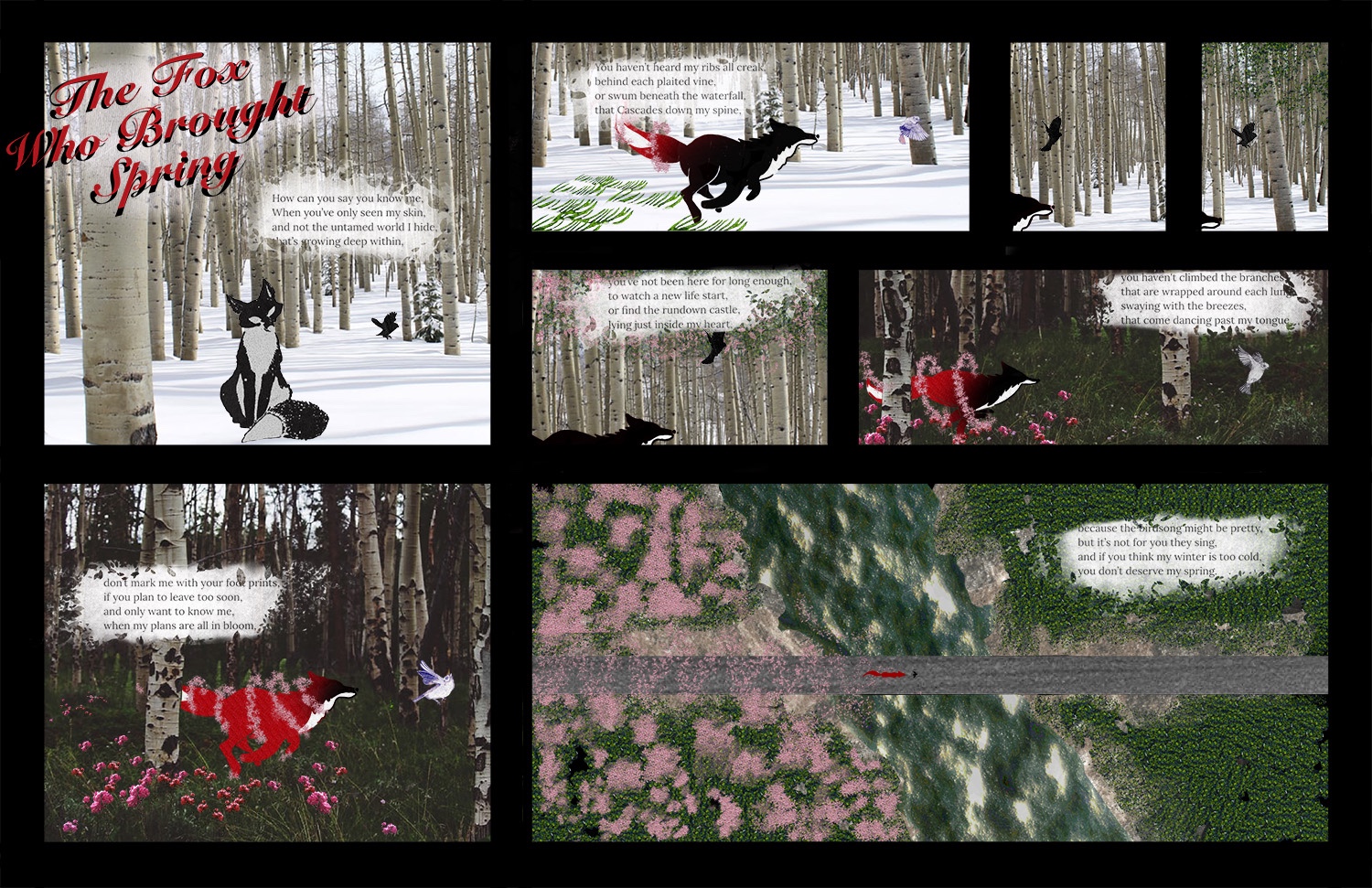 My creative motivations came from taking textures and making something new out of them. I didn’t want to just take an object/scan/texture for what it was i wanted to force it to become something else. The aesthetic experience I was looking to create and convey to the audience was one of transition. Or an experience similar to that of reading a story book. From simple shapes and easily identifiable backgrounds along with the tempo of the poem I think i achieve this.