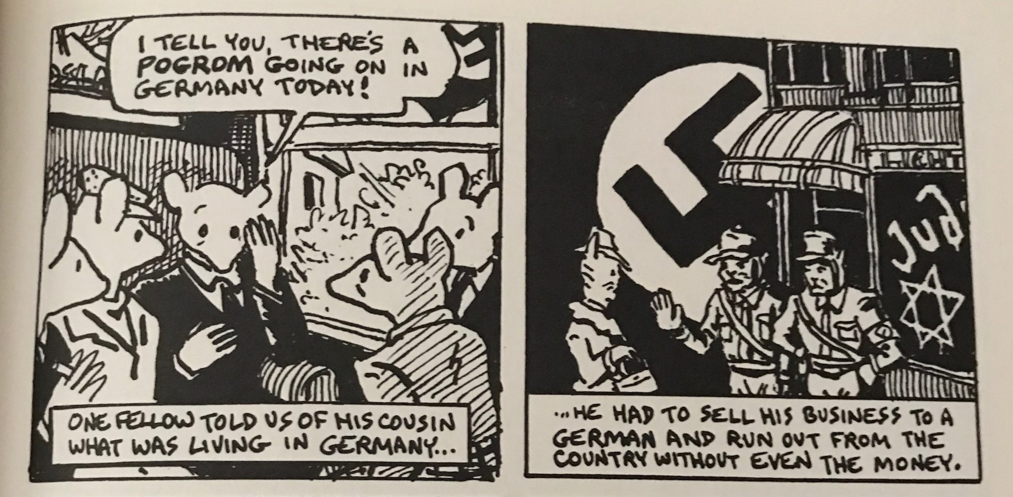 Closure is when the viewer has to mentally fill in gaps between two panels. This can be seen on page 33 of the novel. Scene-to-scene closure is apparent here. The first panel on the page reads with the father in view, another mouse is telling them about their cousin and what is going on in Germany. The next panel we see is the nazi cats in Germany, which we understand is going on at the same time the mice are discussing. Scene-to-scene we can see two events that are taking place at the same time except in different locations. This type of panels also requires closure from the reader. The reader has to understand that these are both occurring at the same time. The right panel is what the mouse’s cousin is currently experiencing, while the other mice who are not in Germany are not.