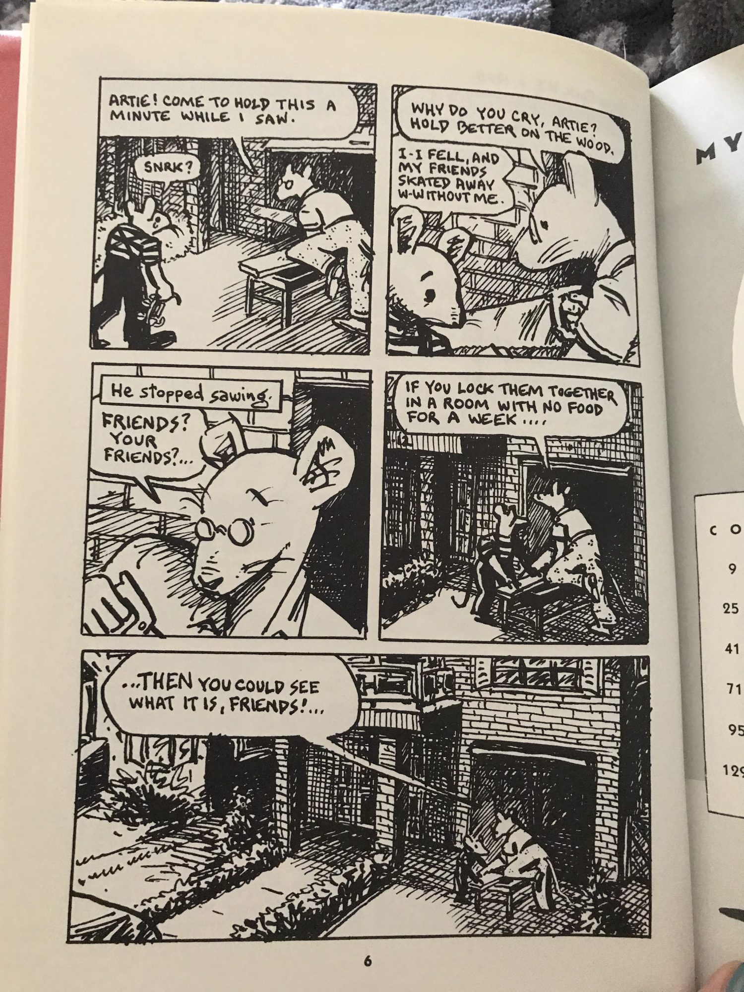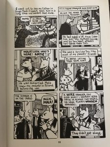 For blog post number 4, I chose to read the graphic novel Maus I: My Father Bleeds History by Art Spiegelman. The novel tells the story of the main character’s father’s life. He tells stories about falling in love with the main character’s mother, and what life was like under Hitler. The illustrator and author, Art Spiegelman uses mice as his characters, while his nazi characters are cats. This creates a dynamic of enemy and allies within the two animals.
