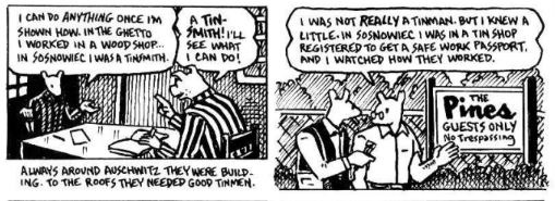 Furthermore, the author uses scene to scene to go back and forth between Art’s conversation with his father and his father’s story telling of what has happened to him during his time in the concentration camp (Art Spiegelman, page 36).