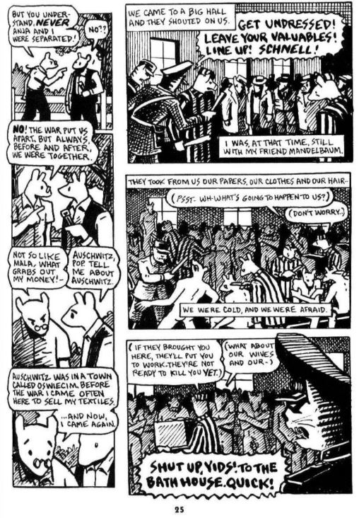 Art Spiegelman doesn’t just use closure methods to inform the reader of what is happening. He also uses time frame complexities to have the reader question the meaning of time and how Art’s father sees what has happened to him as something that he is reliving by speaking about it (Art Spiegelman, page 25). This is seen when Art and his father talk and the reader doesn’t read from left to right and down, but rather left then down then right and down.