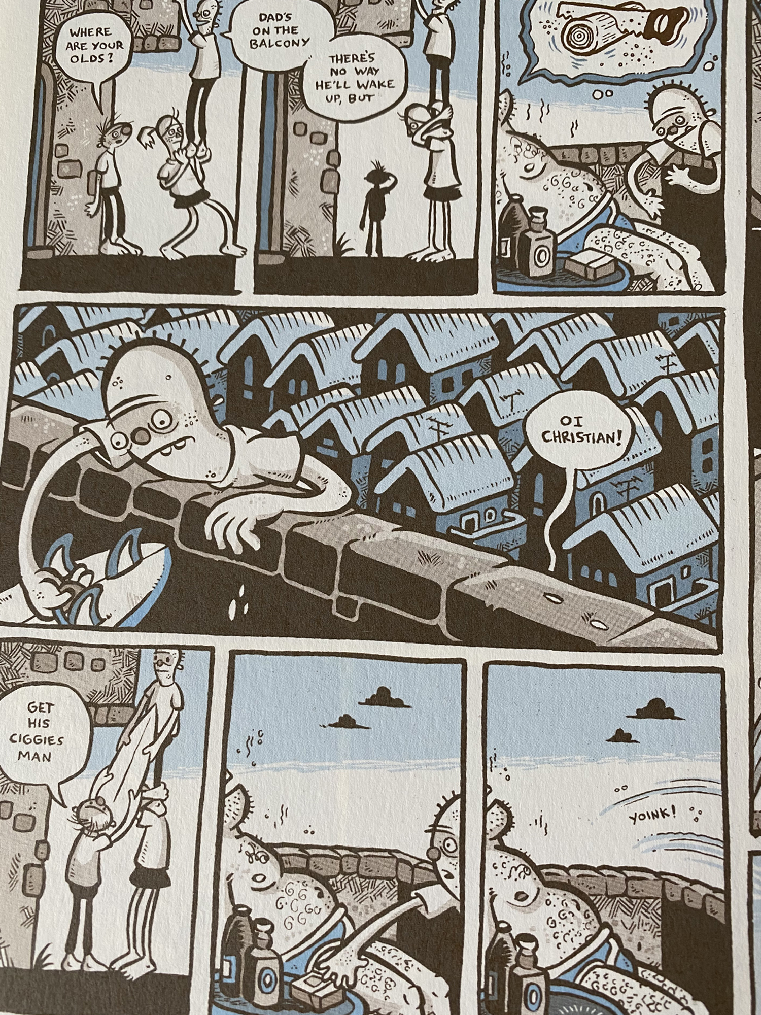 But for this blog I am supposed to find examples of closures and time frames in the novel I picked, it did not take long to find some examples. For my example of closure in this book, I found a page that was connected by the same scenario but divided into different actions. Christian, the character that is being lifted in order to steal a surfboard from his father makes multiple attempts to climb up. These scenes also show Christians’ father and his lifestyle, showing that he is most likely passed out due to drinking. But the main scene that I want to focus on is the last two panels, the closing panel leaves you wondering what happened next. As Christian grabs the cigarettes, the following panel shows a motion of some sort that has the text “yoink!” this leaves the viewer curious. Did Christian fall? Is it the motion of him snatching the cigarettes? or could it mean something else? This I feel is a strong example of closure and by noticing these in graphic novels it helps you think more in-depth about what it is you are reading and the meaning behind each scene.