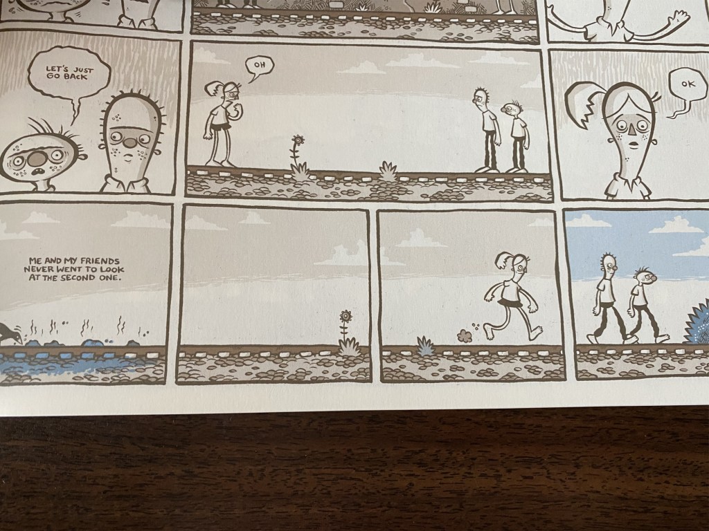 We were also asked to find interesting examples of time frames in our graphic novels and examine them and explain how as a viewer they help us interpret scenarios. For this graphic novel, I found a very interesting example, Christian and his friends are walking along a railroad but as the panels progress they are all connected. because even though these are 4 panels split, all 4 of them are connected because it is the same time period. PatGrant helps show this better by showing one of the characters running to catch up to the other two characters. This is a very eye-grabbing tactic that many graphic novels use, it is fun to look at and adds variety to the panels and the storytelling.