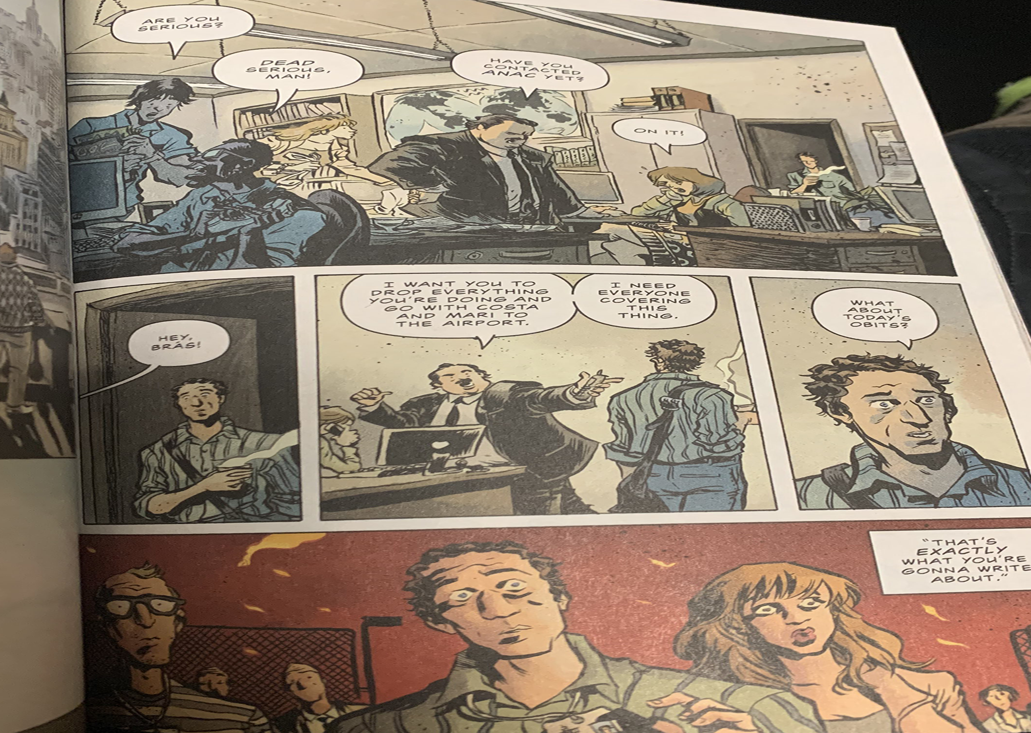 I found this panel while i was skimming the graphic novel and it caught my attention. The panel shows the main character in what seems to be a office environment and then it quickly switches to a intense red panel in a completely different environment. This huge time frame gap really demands that the reader engages with the comic. It is a very extreme cut almost like a movie. One I saw this I stopped flipping and wanted to find out more about the context of it. Its up to the reader to piece together how the two scenes fit together. There is a piece of text that provides some information as how we got the point but the closure is amazing. It feels like I am watching a film and the transition was like a sudden jump cut. That scene engages me and makes me want to read more to find out how we reached this point.