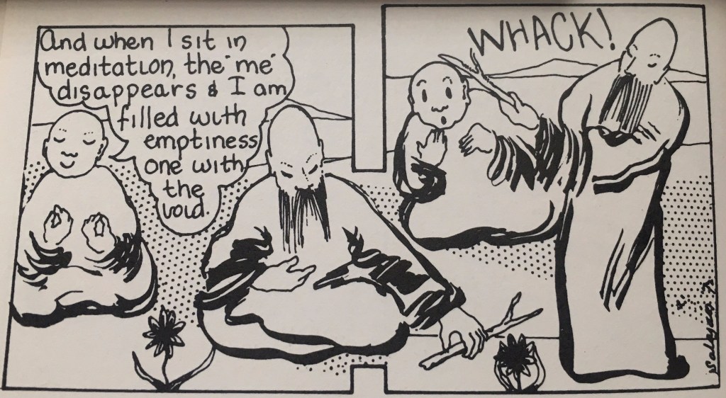 The comic book that I selected for this project is called Zen comics. It’s entirely composed of four panel comics about meditation and restfulness. The panels that I selected for closure are the monk reaching into the other panel to grab a stick and then in the next panel he has the stick hitting the apprentices head with the exclamation whack! I think this panel is an action to action progression because you see the monk grab the stick then in the next frame the same monk is depicting the next motion of hitting the apprentice this makes the viewer use closure to understand the sequence of events between these two actions. Much like the example of the man hitting a baseball on page 70 of Scott McClouds book.