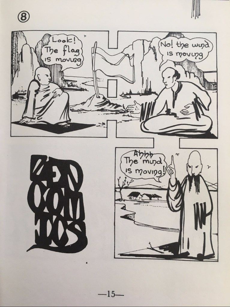 The time frame that I selected is the apprentice exclaiming that the flag is moving, the eye then slides to the flag blowing in a connection to the next panel of the monk telling him the wind is moving finally you move down and the master is stating that the mind is moving. These are all in one connected sequence rather than panels with gutters and yet they exist at different moments of time that can only pass as the reader’s eye moves over it. The panels feature a unique juxtaposition to maintain the flow of this comic, in order to keep the panels connected the last panel is in the bottom right corner rather than the center bottom or the bottom left. This was done to keep the reader in the same moment that there was not a long period of time between these events occurring. The word feature in the bottom left panel took me a while to understand but just says Zen comics which is the title of the book and was most likely placed there to balance out the unique panel lay out.