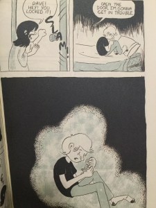 These three frames are interesting time frames because the viewer can look at it either up to down or down to up and still get a similar idea of what is going on. If the viewer starts from the top they might see that the top frames are fast and trying to get Dave to open the door and for the last panel having it be big can show that Dave just sits there contemplating about something. But if the viewer starts from the bottom it looks like Dave is sitting there contemplating something for a long while because the size of the panel and then he gets interrupted to open the door. So, either way the viewer reads this page for the comic it will show Dave contemplating for a longer amount of time than the other panels.