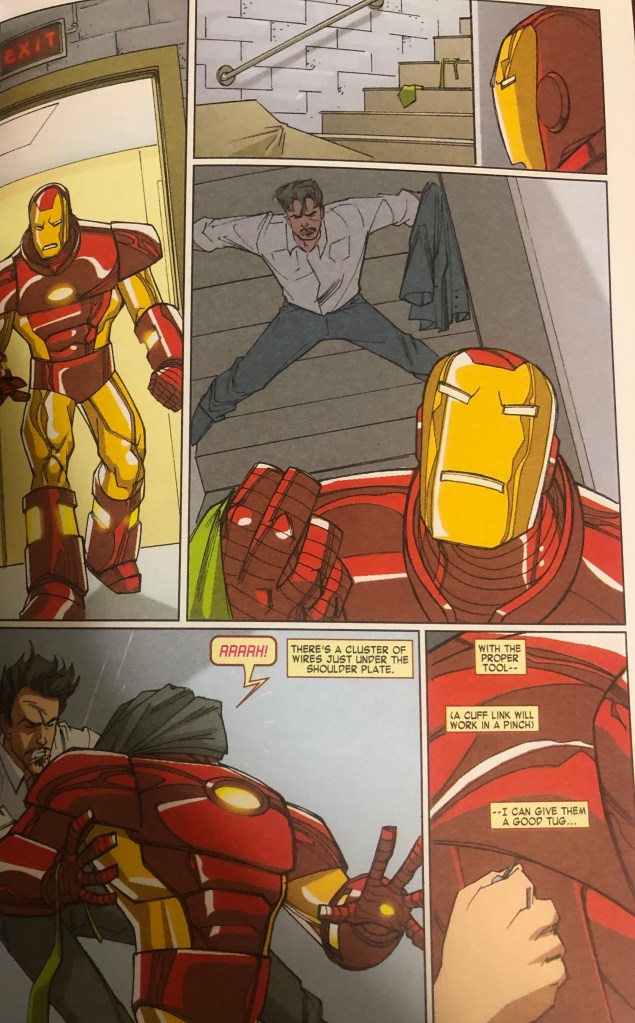 The second example I chose demonstrates “time frames”. The reason I chose this specific page is because it builds suspense as the reader continues down the page. As the reader transitions from one scene to the other you are able to notice that “Iron Man” is looking for someone. The reader soon learns that the “someone” is Tony Stark. Just like the first example I chose, the authors don’t use any words to show what is going on but lets the images tell the story. Creating an opportunity for the reader to develop their own story. Towards the bottom of the page it shows Tony Stark jumping onto the suit in attempts to either disable it or to see who is in control of it. This creates a moment for the reader to decide what is going to happen next. Will Tony Stark find out who is in command of his suit? Or will he be thrown off and will never find out?