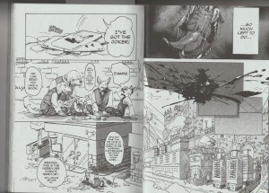 These pages were the most interesting example I found for time frames. I found them more interesting than other examples because as I was flipping through, page 148 (right page), was the only page that was set up and stylized this way. Even though this is a Japanese manga, usually read from right to left, the right page can be interpreted in different ways and it also engages the reader to identify which aspects to read first. Interpretation is also an interesting factor because of the different ways the wolf is drawn. On the right page he is drawn on a large scale using darker tones and hues, while the wolf that is seen throughout the manga is still drawn in lighter tones and hues. The use of drawing the wolf in a more scary and monstrous way is carried over to the left page as well as the reader sees him fighting himself. It could be interpreted as a Jekyll and Hyde trope (man vs self).