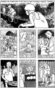 At first glance I attempted to guess what the comic could possible be about. From the single panel I assumed that it was a family that just went through a horrible misfortune of having an accidental fire take away their home. And later that they would have to work their way back up by finding a new home to live in. When I found Eroyn Franklin’s website full of her archived comics I was able to finally read the full comic. To my surprise, the comic was a little to the way I interpreted it. There was just more depth in the beginning of the comic. It was a memoir to her early 20’s and it illustrated her life as a “dirtbag”. As she was hanging out with a friend she sadly had to come home to a fire at her house.