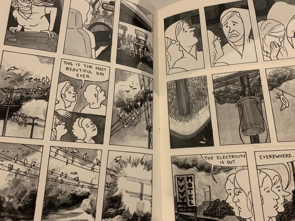 When visiting the WSU Art Museum Collection of the Northwest Alternative Comics collection, one artist stood out to me as I read one of her printed works. However, for this post, I will be focusing on the printed work by her, “Making Tide and other stories” by Eroyn Franklin. In this work, it seems to be a comic made of pen and ink, scanned perhaps, and turned into a printed piece. “Making Tide,” follows a girl throughout her travel in a country that is near a beach of some sorts, suggested by the title. The main story seems to be how her and her friends approach bodies in a cave while on an activity. With this, some elements and principles of design I noticed in this work is the lines/shape as the work seems to be done entirely in pen. This makes the texture of the work appear smooth, or more soft hard, much like a pen does to paper due to the heaviness ink can have. Franklin also avoids color as the entirety of the comic is in black and white, once again due to her chosen tool. In terms of principles, I recognize dominance, and contrast. This can especially be seen in the example provide below. The girl and those with her are admiring all of the birds flying in a group around them. This is until the birds land on a wire for electricity and a lot of them get shocked, unfortunately dying. As you can see on the left hand of the pages below, the background where the frames how the persons are lighter and remain a simple background shaded in. However, upon the birds dying, the people are shown in three frames in which the background is darker. This affects my interpretation of the comic as this simple decision enhances the thoughts and emotions shared between these two people, such as disbelief, and severity of what happened. The background on the right hand differs by not only being darker, but shows a bit of a pattern with squares, being dominance. It is also contrasts in light or dark between the frames on the left and the right, a decision made so readers can read the situation without a linguistic tool. In terms of closure, I noticed subject-to-subject in this same example as readers can see birds become shocked and die by the electric cords running through the city. A few frames after, a linguistic tool says that the electricity is out everywhere, in which since the two situations are related in terms of subject, it becomes an example of closure through subject-to-subject. This is for readers are able to connect the two situations and state that the birds are the cause for the electricity to be out everywhere.