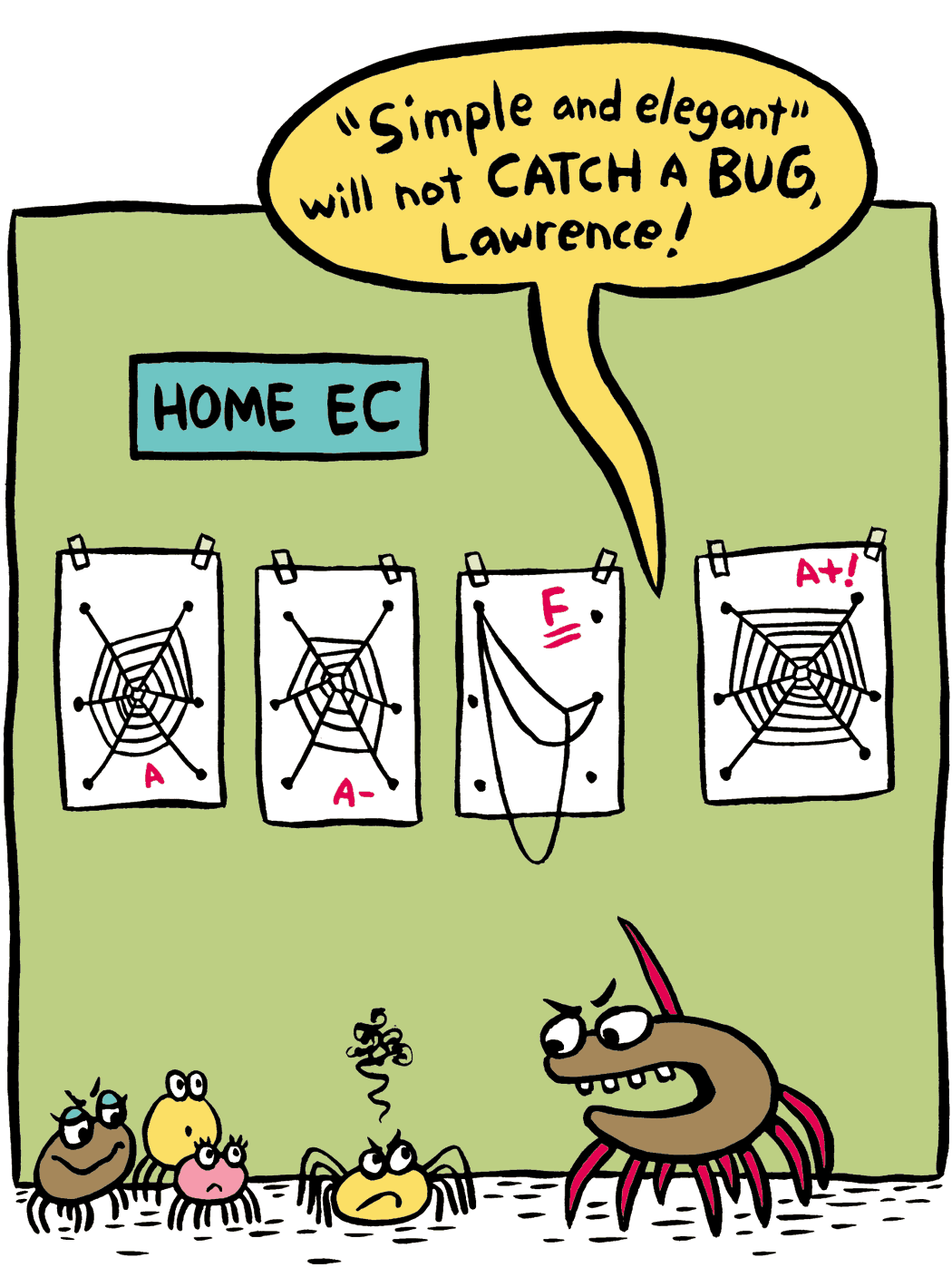 The illustration in the comic is fairly simple but intentional. The varying line thickness in the border and detail illustrations create a sense of motion and energy in the still background. The slightly muted but spring tones chosen for the color pallet give the comic life and energy and the young spiders being pastel spring tones makes them seem young like this comic is occurring in an elementary school or middle school.