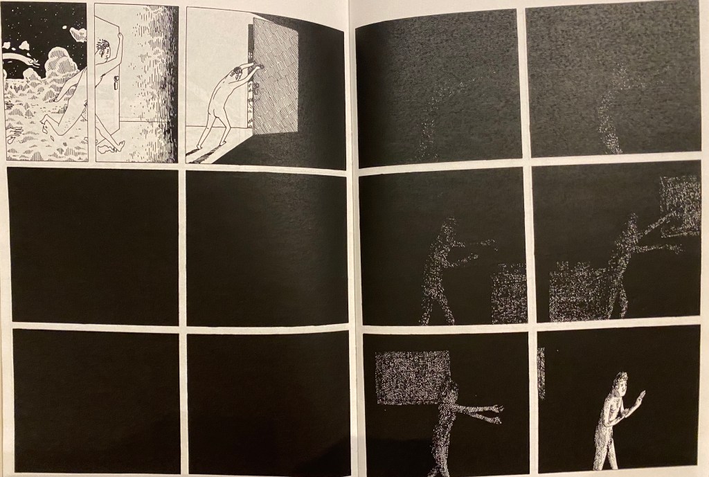 This comic is interesting to me because of the use of panels. I think by using the same size of panels, it conveys a consistency in time. These panels show that time is consistently passing by at the same rate. Dow also shows this by keeping many panels black. In the first panel there is a man running into a dark room. By keeping several panels black, the reader visualizes the man walking through the room for a period of time until he reaches the light. This demonstrates the repetition principle of design. You see the silhouette of the man slowly appear in the panels. The whole scene shows harmony in that each panel effectively flows into the next. I really liked the use of light in these drawings and found it very interesting how he chose to draw the light in different ways. This scene is very simplistic but I think it shows different elements of design like texture and color. The texture in the frames on the second page is interesting to me because of the pointillism style Dow uses. The pointillism is a very effective way of creating hazy shadows in the dark and looks very similar to how our eyes see in the dark. I also liked how this comic differed from other by only using black and white as color. This is because of the tool used, the ultra fine pen. Overall, I loved Dow’s work because of how different it was from the traditional comic and because the story was so unconventional and interesting. The drawings were very detailed yet simple which I thought stood out from some of the other comics I viewed.