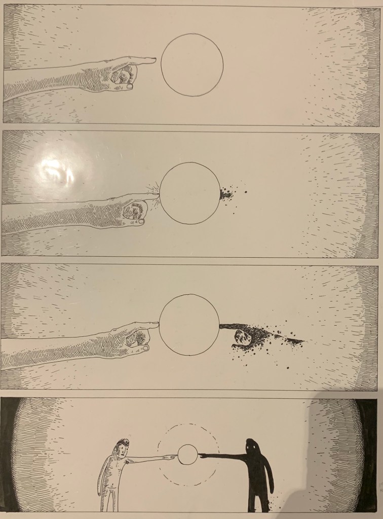 Dow uses contrast to show separation between the two characters in his comic and the white orb. Another character appeared when the comic character touched the orb. The characters are the same person, but one looks like a realistic character and the other is merely a shadow character. The contrast between the two characters shows the separation between them, even though they are the same person, at least shape wise.