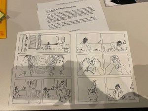 The alternative comic that I looked at during our time at the Collection Study Center is the mini comic called Sorry Sheets by Eroyn Franklin. For elements and design, Franklin uses repetition and different forms of lines. The lines that are used are mostly used for shape and texture. The shapes that can be seen are the shape of the main figure seen throughout the comic and of the figures hands. Lines are also used to create hair for the figure as well as the texture for the rug. The lines that are used for the hair vary in length and direction. Franklin also uses a form of implied lines for the rippling water effect. There is also a great contrast between the clean water, represented by the white color, and the water that gets mixed with blood, the black color. The contrast creates a pattern within the rippling water as well, which is a form of repetition.