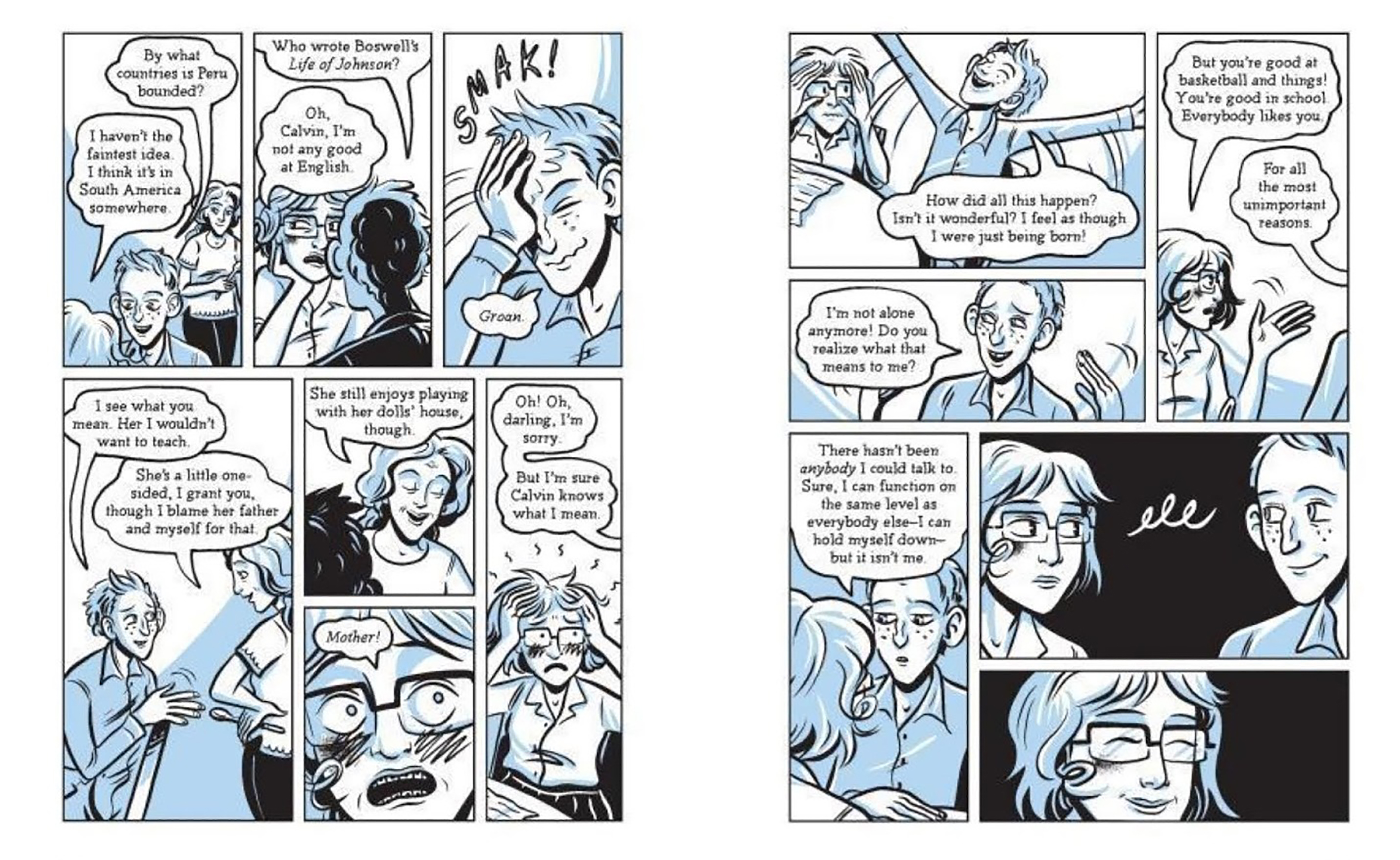 As you can see the artwork that Hope used was more detailed than a lot of other cartoons that we see. Even though it is mostly in blues whites and blacks we can tell very well the emotions and can identify who each character is. In McClouds book that we are reading called Understanding comics, he mentions that when you are doing comic there are more developed characters and less developed characters. For example, his character is less developed in that it does not look exactly like him but you can still tell who he is. I think that this graphic novel is a bit more towards the detailed side because there are hair details and face details on the characters. Another thing that we can see in this screenshot that relates to the reading we had this week is that we can tell emotions through the artwork. In chapter five McCloud gives many examples of how an emotion can be shown through art. The place that I think that Hope Larson does this is when Meg is embarrassed by her mother and you can see the emotion on her face through the lines on her cheeks. Even though there are not the traditional red cheeks through the lines we can infer her emotion.