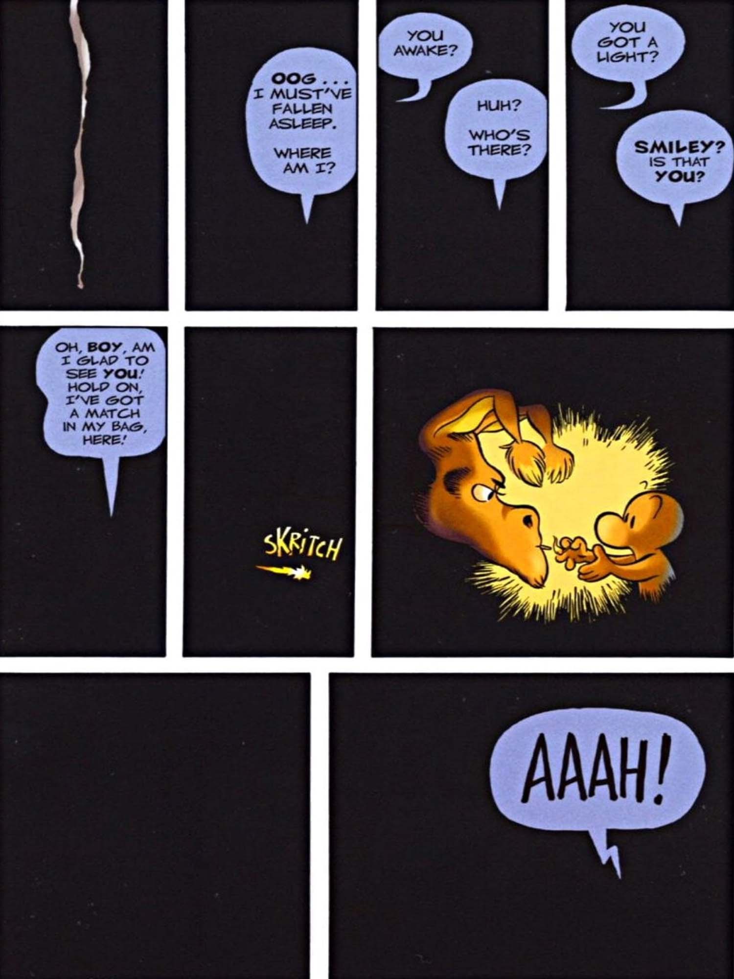 Scott McCloud’s “Understanding Comics” chapter “Living in Line” talked about all the types of iconography that are commonly used when people create comics, and I noticed that many examples that he used were also used throughout “Bone: Out From Boneville”. The iconography in the comic book was warm and gentle. There were many symbols that were used throughout the book that thoughts and emotions. There were also many sounds that were in a strictly visual medium. The book also used color to set the mood for the panel throughout the entirety of the comic. For example, they would use pitch black panels to represent a dark cave and build up excitement because the characters as well as the reader has no idea where the character is moving and what surrounds them.