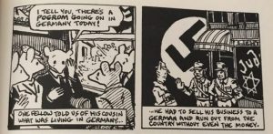 When applying this graphic novel to the 5th chapter of Understanding Comics, living in line. The deep dark lines in this specific example represent madness. Scott McCloud mentions many examples when giving examples of what lines can represent. Madness can be seen within this panel of the book. It focuses on Nazi cats, giving them the visual of being bad, or in this case, mad. The lines are thick and dark making the panel with the cats seem “scary” and “bad”. Elsewhere in the book panels are seen with the mice are light and thin lines, such as in the left panel. Again the iconography and lines play a role in the good guy vs bad guy stereotypes.