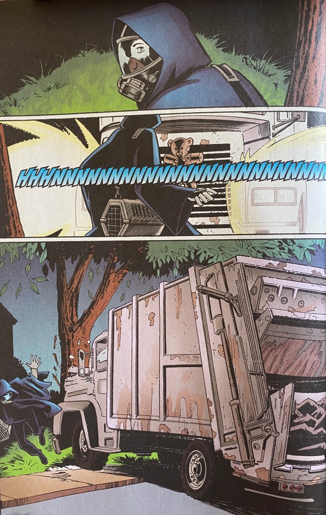 In Scott McCloud’s “Understanding Comics” chapter “Living in Line” I noted his explanation of how using elements like backgrounds, line types, and font types can evoke different emotions or experiences. The iconography used in this comic book is centered around detailed scenery to convey emotion and different lettering styles to capture different sounds. The detailed illustrations are important to the story because the story is meant to be very dramatic and apocalyptic, so the scenes must convey that effectively. I also found that the use of lettering in certain frames can determine the mood, as Scott McCloud mentioned. The harsher lines and bigger, all capital letters invoke a feeling of intensity so that the reader understands that the situation is meant to be dramatic.