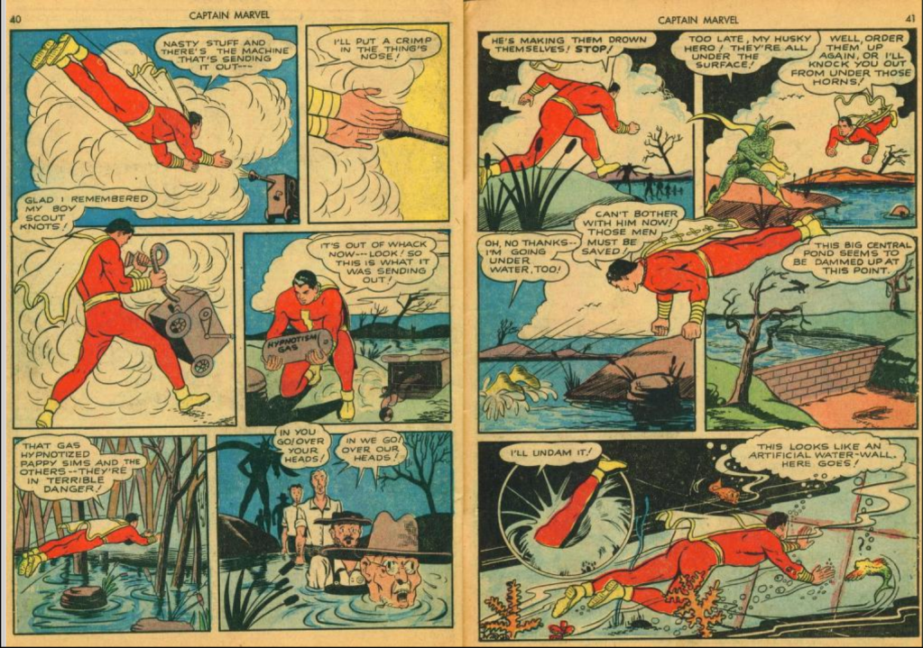 The next morning, Billy interviews the government engineer, who characterizes the “swamp devil” as being just a crazy superstition, but admits that the swamp has been expanding and he hasn’t so far been able to stop it. Meanwhile Pappy Sims rallies up a hunting party (himself plus 3 guys) to deal with this Swamp Devil once and for all. They encounter a cloud of hypnotic gas, and the Swamp Devil shows up and orders them to follow him, which they do. Billy arrives shortly later, and is almost overcome by the gas, but turns into Captain Marvel, who can resist it; Cap finds and disables the gas-spraying machine, then rescues the hunters from being drowned by the Swamp Devil, who escapes again into the swamp. Cap then explores the swamp, and finds a dam where there shouldn’t be one, and a beaver-house-style hideout, and also gets attacked by the knife-wielding Swamp Devil. That fight is only one punch long, and the dam is quickly broken, which begins the process of draining the swamp.