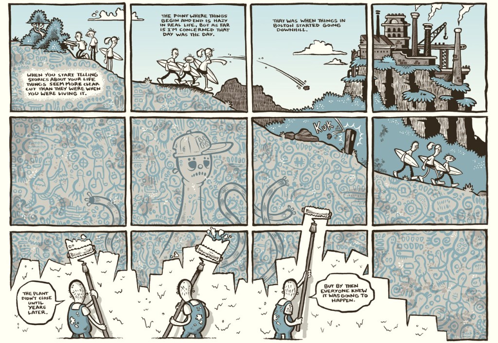 The Iconography and drawing in this novel are like no other, only using the colors blues, white, black, and grey, this book definitely sets a mood right from the jump. Using great use of space, Grant has a wide variety of box sizes and images throughout this book. The whole book reminds me of a lot of what Scott McCloud’s living in line talked about, giving the viewer a sense of emotion and senses. Having the whole book be filled with the color blue gives off an emotion itself, a sad emotion. I believe Pat Grant did this on purpose, seeing some of the things that Pat saw growing up in Australia, he wasn’t going to pretend that Australia, was perfect. His home has its flaws just like any other country does, and Pat wanted to show that in his Novel.