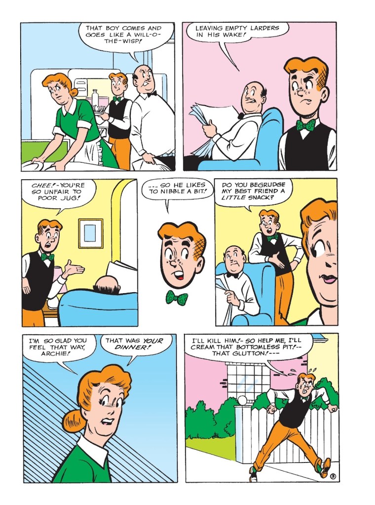 The comic book that I have read was the Archie and Me comics. I read this because I really liked the bright art style and the humor in each of the comics. In the comic that I read, it was full of smaller short stories. Each one of the short stories contained at least Archie or one of his friends, mostly Jughead, as one of the main characters. They were short skits of humor, one of them was about how Jughead went around the town and ate everyone’s food. There was another story on how Jughead and Archie were trying to make it on a TV show by going around making weird and strange noises and how Veronica thought it was silly of them to make those noises. Then Veronica was about to get robbed, but Archie and Jughead scared the robber off with their fake cop noises. I think that Kennedy Smith chose to make the comics so bright and cartoon-like because the comics themselves are bright, light, and funny. The art style suits the stories and the characters personalities. I really liked this comic because it was different. This comic wasn’t one of those super popular and serious superhero comics, it was more uplifting and relatable. This scene that is pictured below was probably one of my more favored and relatable stories. This is about Jughead going around the town eating everyone’s food before he is even seen. Eventually, he hits all of the main characters’ houses, so they all go around to look for him. They found him in the end, but then Jughead “apologizes” by giving his friends tickets to a show that they missed the year before. He gives them the tickets and they notice it was to the right show, but to the show the year before. Before the group could confront Jughead, he was already gone eating someone else’s food.