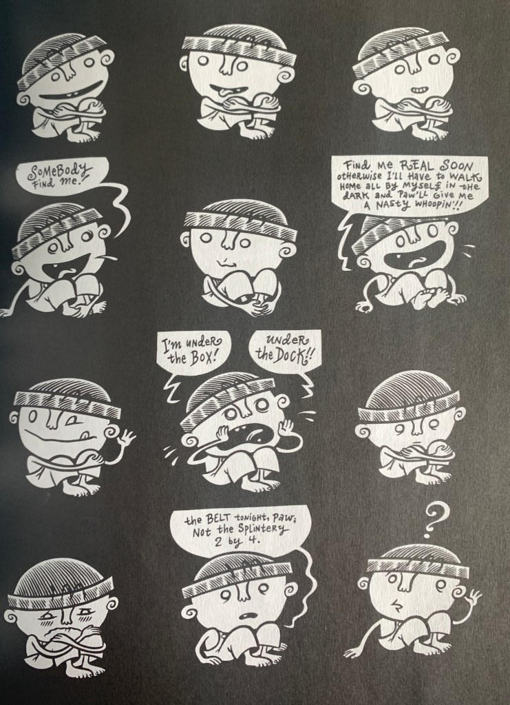 Thompson uses the ocean to evoke emotion in the story. Thompson draws the ocean dark and depression. It conveys the negative emotion Chunky has when he’s on the boat. This relates to Scott Mcloud’s chapter, living in the line.