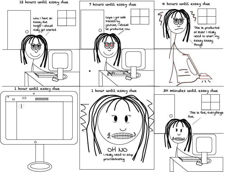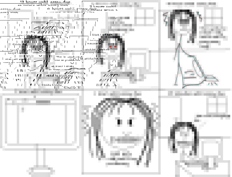 Between the panels there are also big leaps in time but not much story is lost in the gutter, for example when the person starts to vacuum you are able to tell that it is the same character who was just on the computer getting up to do something else more productive than simply watching youtube at their computer. I mapped out the time until the assignment that my character had an assignment due at the top of each panel so the comic has its own sense of time in it and the reader can be aware of the rate that things are occuring in the comic. Lastly I chose to use color very minimally in this, I chose to stick to black and white because I felt it was easier to add more detail without the comic quickly becoming overly busy and difficult to process. I only used color in the eyes when the character is watching youtube and I did this to show what they were watching on their screen in a way that was able to stand out to the reader.