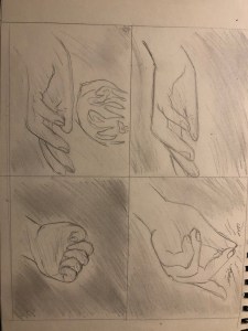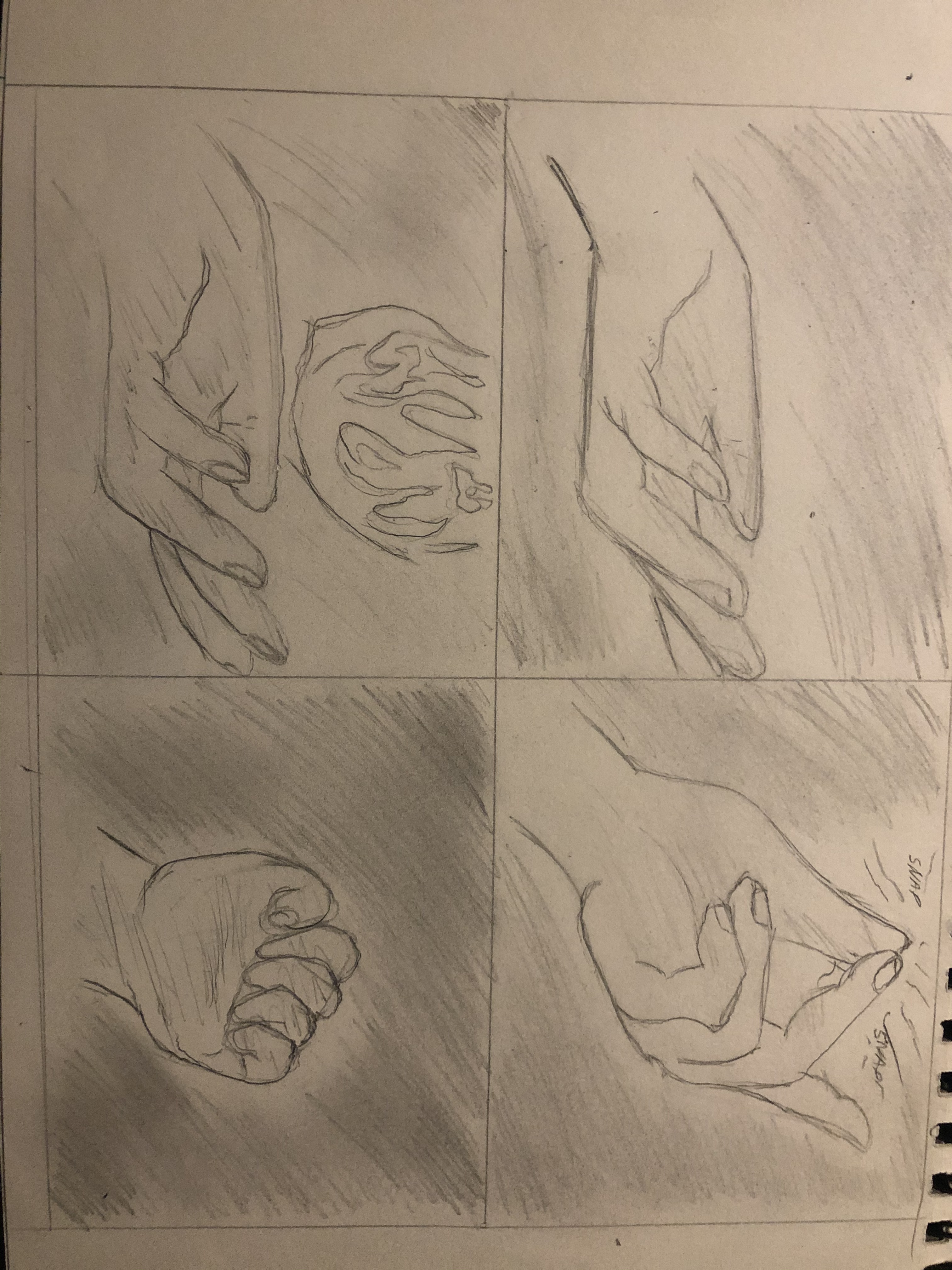 The type of closure that I used for my comic strip was mostly movement-movement. Usually when I create comics I like to create pictures and let the pictures tell the story instead of using words. The reason for that is because I want to be able to connect with the reader and give them the ability to create their own story with my art. With this comic, I would say I do work with time because by having an open hand, snapping, back to an open hand then a closed fist, takes only a few seconds. The reader is able to tell that there was not much time between each action that the figure was doing. Also I think with a plain background, it was easier to create a sense of time because the focus is only on the hand.