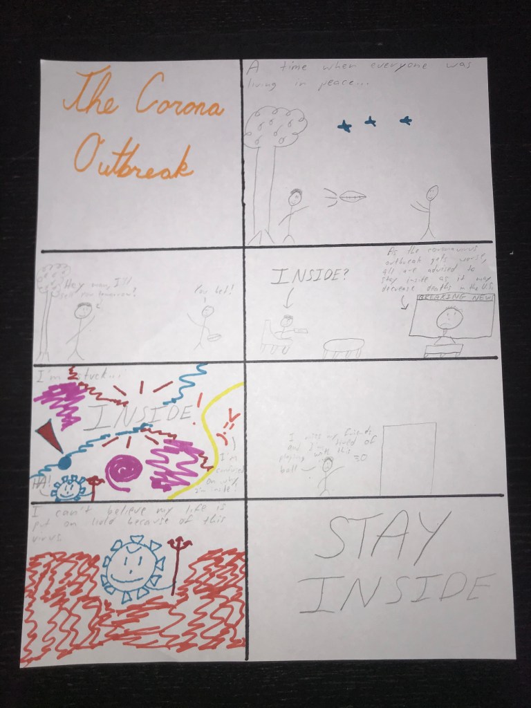 My strategy for my Week 13 comic is to correlate my ideas for the comic and Scott McCloud idea of “the invisible realm of senses and emotions.” The emotions that I want to convey in this comic will be about anger and confused because of the coronavirus. My idea for this comic is feature me but dealing with the coronavirus. In the end, I want the message to display on how to stay inside and how I am confused and frustrated on how to stay inside. Due to struggles with accessing Photoshop, I would like to use the hands-on method. I believe I can just use crayons and outside resources like leaves. It would be easier that way and I can also convey to the audience what the comic means. The word “INSIDE” shows how there is confusedness and anger because of the crazy shapes and colors that show how confused life is right now for everyone. The crazy red, blue, and purple lines represent the chaotic energy from being inside and how the mind can possibly lose sanity because of being inside for so long. The circle at the bottom represent the actual disease for COVID-19 and how it represents the devil because it is taking people lives. The anger face at the bottom left represents people’s reaction to stay inside and their plans being ruined. People staying inside for a long people of time is not normal.