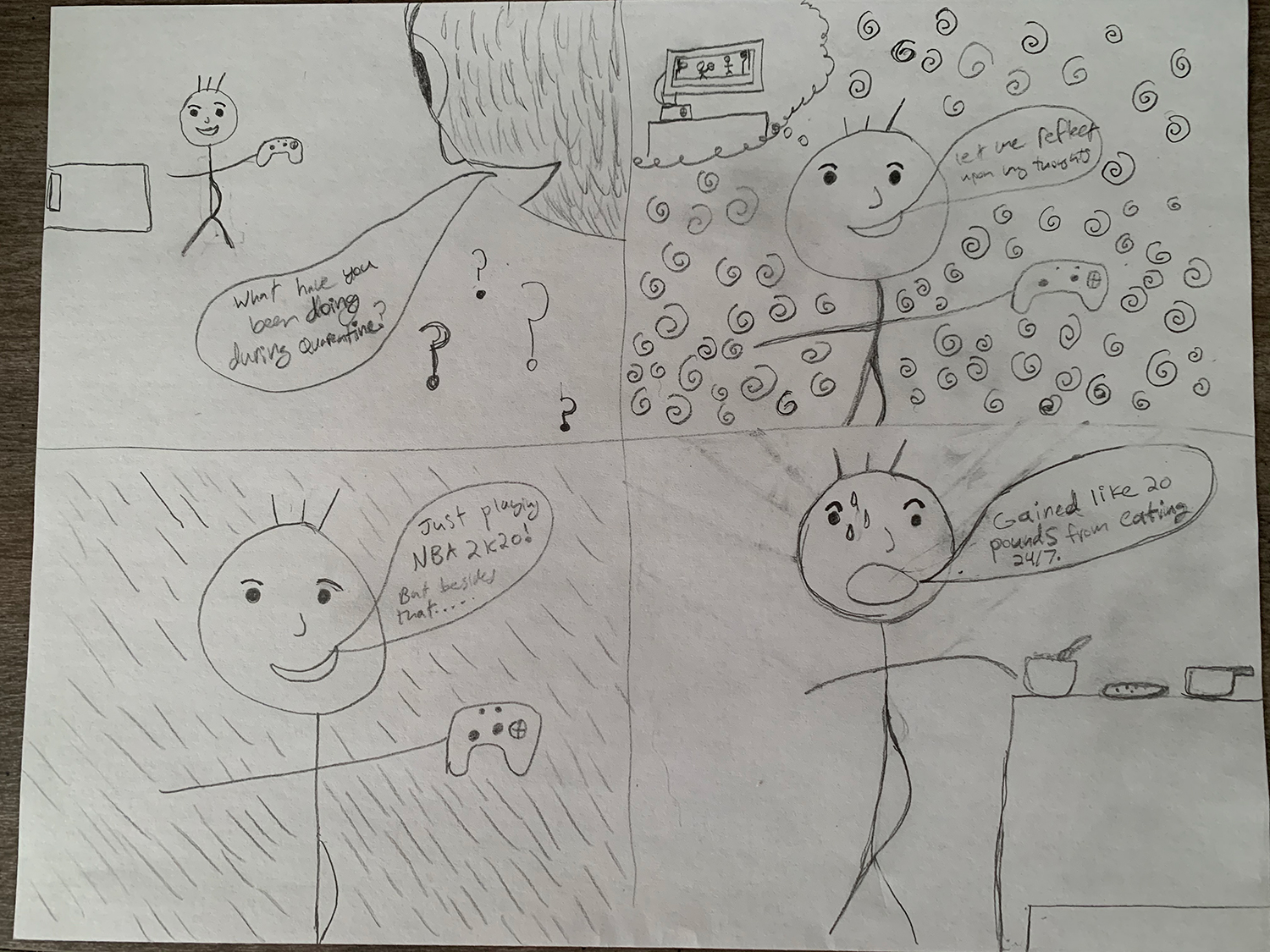 paper but I tried to still work with line and give it texture of some sort. I think the pencil actually worked good on the bottom left frame because it gives off the sense of thinking or realizing something.