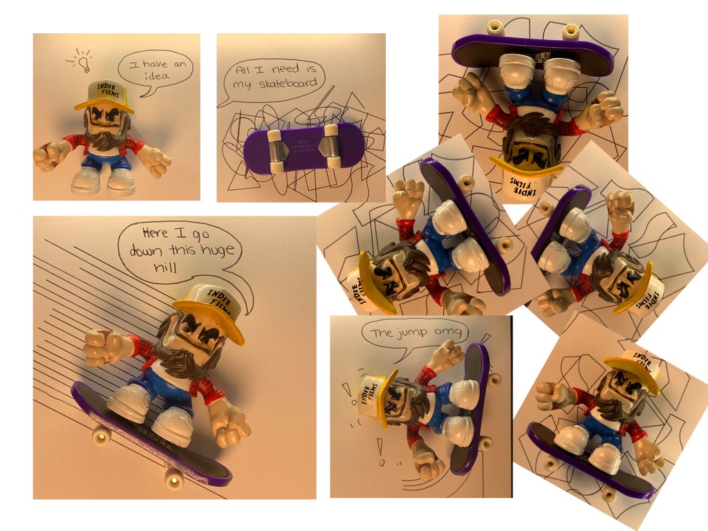 In my comic, I wanted to convey a lot of craziness. I used a lot of crazy shapes overlapping each other to give the emotion of adrenaline. I used a lot of straight lines to show the character going full speed down a hill. I used text bubbles so the character could talk. I used a light bulb to show the sense of the character having an idea. I also used exclamation points and little lines to show the characters emotion right before the jump. I also put my panels all over the place because that is what it feels like to be flipping through the air. The panels, even though they seem like they are in a random order, your eye is supposed to follow him flipping through the air. For my comic I used some old action figure with a skateboard I found in an old box. I used paper and my drawing ability for the background. The hard part was getting the lighting right because I did not want shadows all over the paper. I used three different light sources to fix this problem. I made one of the panels really big and that panel was when my character was racing down the hill. I wanted to show that it took more time than the rest of the story. I wanted to show he was going down a really big hill and picking up lots of speed. The closure that takes place is when my character goes up in the air. The viewer never sees him land the trick. So there is no closure for the viewer. They have to assume what happens. I really enjoyed making the comic. It was cool using real figures with paper and pen. It makes for a very interesting visual.