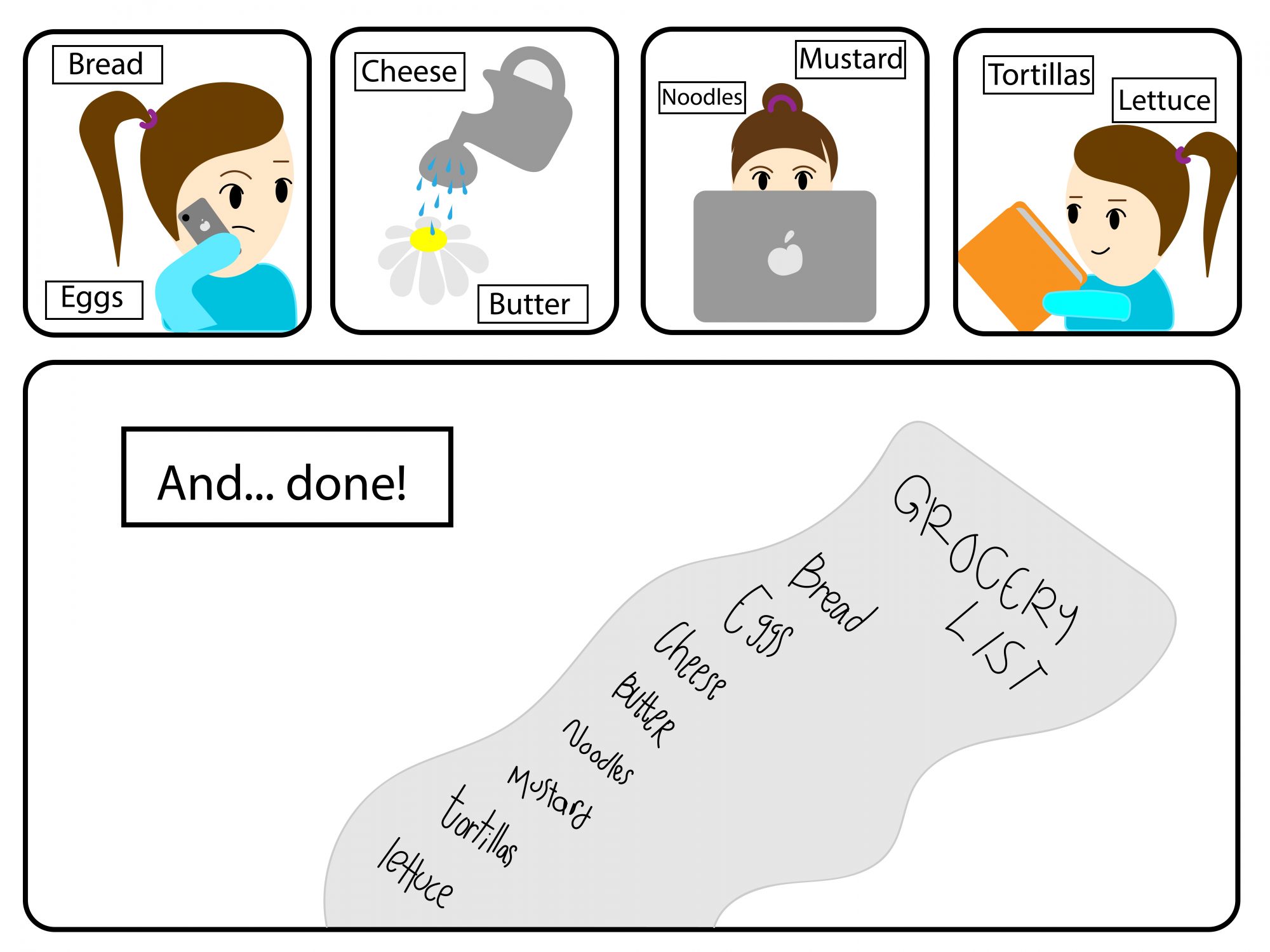 I chose to make a comic this week that displayed the interdependent word-picture combinations concept of parallel. Parallel is when “words and pictures seem to follow very different courses” according to Scott McCloud. I showed this in my first 4 frames when the girl is doing everyday tasks: talking on the phone, watering her plants, browsing the web, and reading a book. The words surrounding her do not fit the theme of the panel which might confuse the reader at first but then they realize by the end that the girl was just composing her grocery list in her head throughout the story. I used a lot of the paintbrush tool in Illustrator for this weekly comic. While it was an easy way to create the shapes I wanted, it was also a very easy tool to write letters with. I used the paintbrush tool in the final frame and wrote out the grocery list for the girl. I like how this gives the girl more personality. The reader of my comic would not automatically think that it is my writing but it is the girl’s, allowing them to sympathize and realize that this character (even though she really isn’t) is human. In addition to this, I also believe I have covered the concept of closure in my weekly work. I allowed the reader to understand that in between panels there is time occurring and that this comic takes place over the course of the girl’s day. Each panel is a new activity in the girl’s day and the reader must visualize that there were steps the girl took in-between to get to where she is in the next panel. I am very pleased with the work I have created this week. I find my story to be relatable, and hopefully, my readers can also relate. I believe that I have incorporated this week’s reading concepts and past concepts into my work.
