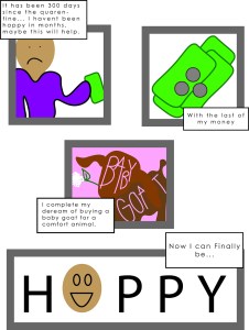 For my weekly blog this week I choose to use the experience we are in now, quarantine, to talk about what I would do if we get to day 300. The way that my comic uses interdependent words and picture combinations is that it uses the words to tell an inner thought type of words. In the McCloud book that we are reading in class, he talks about how by using the thoughts that someone has in their head it can help make your comic be more interdependent. I also thought that since we have quarantine right now I thought that it would be interesting because we are alone and haven’t been talking to people and so the character would be more comfortable in their thoughts. I attempted to use montage in my comic like the book had by using the word happy and replacing the a with the characters face that is happy. I also tried to use montage when I put the words baby goat into the body of the goat. This did not turn out exactly how I wanted it to because I wanted the words to make the words actually form the goat’s body but I could not figure out how to do that. I will continue to try and do this with our next comic. The tools that I used were a mix of Illustrator on my computer and adobe draw on my iPad. I found that drawing what I wanted the character to look like first, copying the image and putting it into illustrator, then tracing over the drawing with the curve tool was a way better process. I tried to use time inventively in this comic by doing a close up of the money and in our book, in chapter 4 McCloud talks about how doing a close up lengthens how long it feels. I wanted someone to really get time to think about what she was thinking.