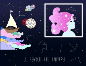 For tools and techniques, I did use illustrator again. However, unlike last week I challenged myself further and took into consideration the feedback I got from last week’s comic. I wanted to add more color but also keep it simple. I also used the gradient tool in order to create and color my female figure’s hair. Using this tool really helped me get the effect that I wanted for her hair. It also added more dimension to my comic instead just having it all be solid color blocking. I also used the gradient tool for the background of my comic, I originally was going to just have it be all solid black. But then I decided that it made my comic look too boring and plain, especially since I was already using a simple color blocking for the boat and clouds. For my planets I used some of the photoshop effects within illustrator, I did this because I wanted to do something else besides gradients and color blocking. I chose the stained glass effect because I liked the way it made my planets really stand out. I also used the glow effect for several objects within my comic, such as the silhouette and the stars. I feel this adds more to the space aesthetic I was going for. It also helps my figure in the boat to stand out more and not be lost within the background.