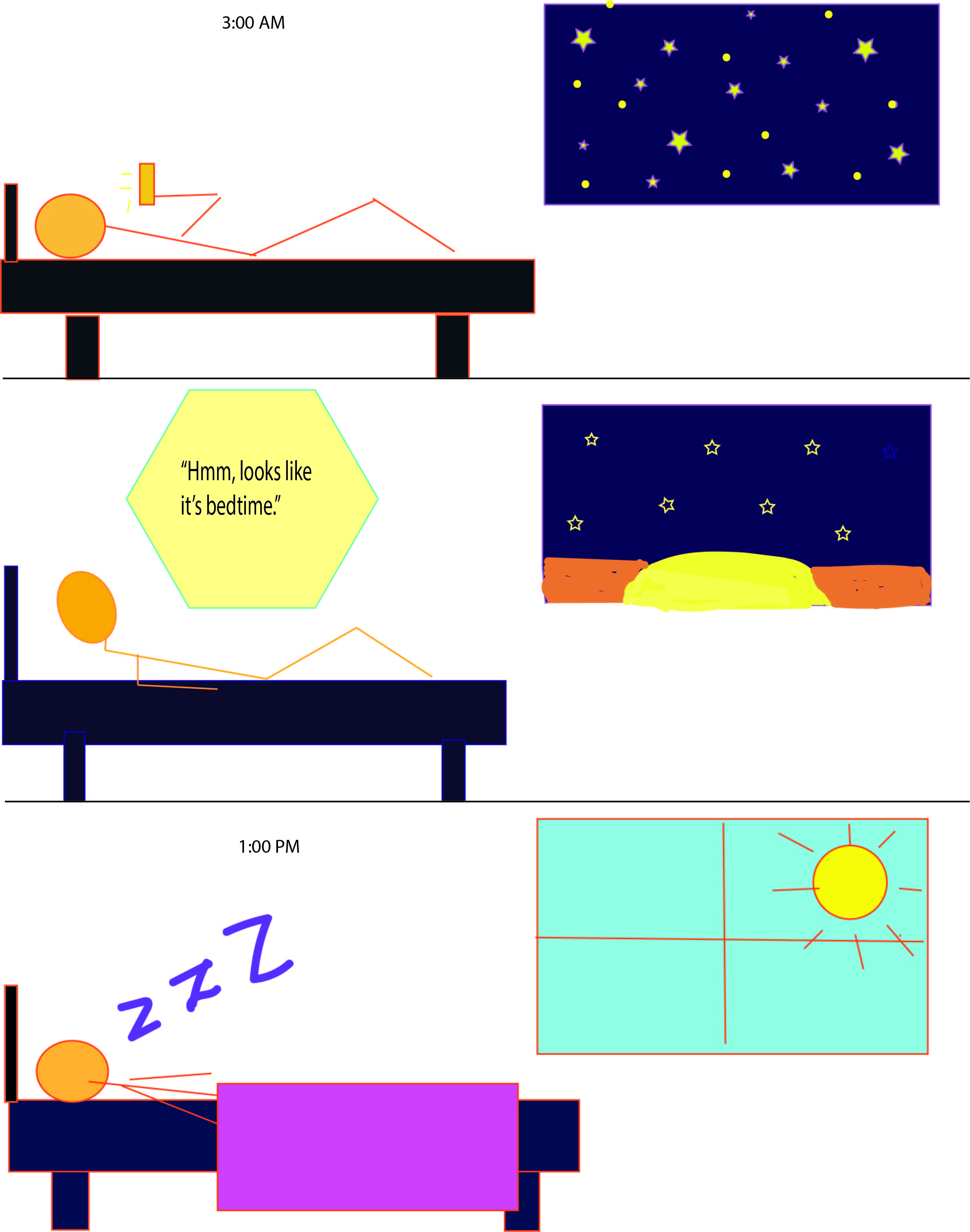 I wasn’t sure what to create in the beginning, but then I thought to keep it simple. I saw many people on social media say their sleep schedule was way out of line and that made me think of mine. I like to think my sleep schedule is pretty normal. So I decided to do a comic that I think many people can relate to. While being stuck at home all day with nothing to do, I realized to make my comic about that. I am usually always in my room and on my phone because I don’t have a TV in my room. I usually go to bed around midnight and wake up around 10 am. That’s actually pretty early for me because I like to wake up really late, but I have to take care of my nephews. I wanted to make the comic a little more funny so I exaggerated on the times. Even though I’m sure there are some people who actually have their sleep schedule like that. I was going to start the first frame with the sun out but then I thought it would be better to have the night sky because I wanted to show that is when the day is starting. In the first frame, the stick figure is using a phone, it might be a little hard to see that because of the color. I was going to choose black, but I didn’t want a lot of dark colors since the bed was already a dark blue. But I wanted the bed to be dark because it stands out, to show that the figure hasn’t moved all day.