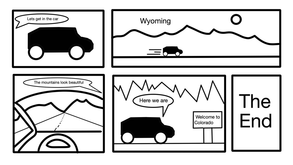 For my comic this week, I created a scene where a car drives from Wyoming to Colorado. I used techniques from Scott McCloud’s, Understanding Comics. I used the additive combination of words and pictures and the interdependent technique in the first panel. The first panel is additive because the words add information to the image and the story. It is also interdependent because the words and pictures go hand in hand. The second panel uses the interdependent combination as well because the picture and the words go together to set the location. The second panel also could be considered a montage because the word is integrated into the image. The third panel uses the additive combination method because the words do not do anything except add information to the image. The fourth panel uses additive, montage, and interdependent. It is montage because the words in the sign are a part of the image. It is interdependent because both sentences go hand in hand with the image. It is additive because the words add information to the image to set the scene and describe the story. I used an app called sketchbook to create my comic. I assume it is very similar to illustrator but much more simple. I like using apps like sketchbook because it can make it really easy to create perfect shapes. It is especially easy to create the panels using a software, versus hand drawing the whole thing. I used a really long panel of the landscape to show that the car is driving for a long time. The only closure in the story is at the end when the car arrives at the destination. The viewer has no closure and has to assume what the reason is for the trip and who is in the car. I never put a person in my comic to make it more universal.