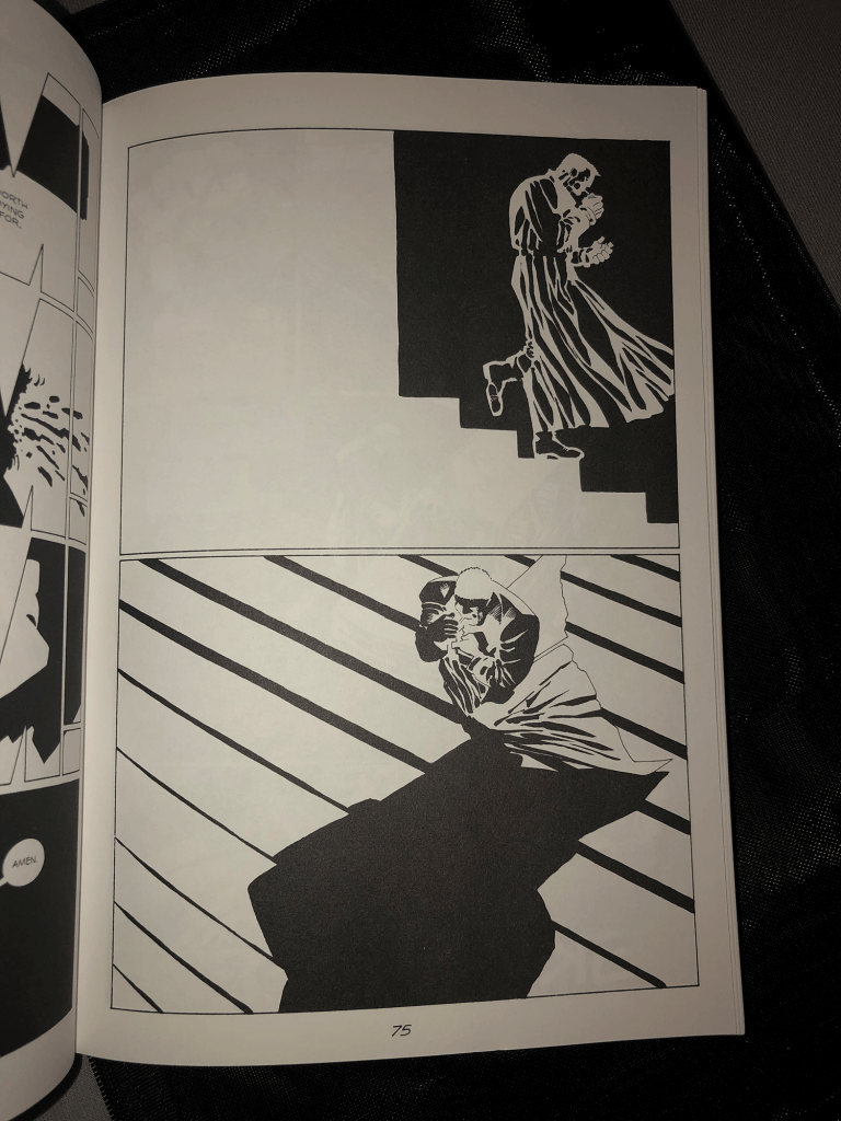 The important thing to note is that while the entire story is depicted in black and white, it’s still able to capture the feel and atmosphere of Sin City. Miller is never afraid to take up an entire page, full-bleed just to get the point/feel of the environment across. Marvin is a lonely character that struggles with his own mental health. Many people are afraid of him–for good reason, of course. This coupled with his violent history and complex character qualities can be very challenging to illustrate and Miller does it perfectly. As Marvin traverses through various obstacles and uncovers more from the story, it feels as if we the reader are glimpsing into his life and what it feel like to be in his shoes.