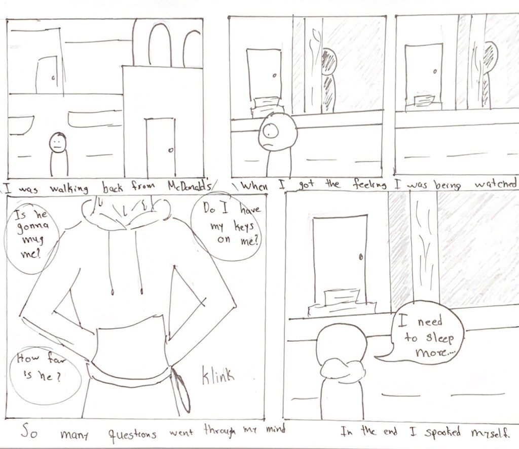Learning from my previous comic I once again used sharp and defined lines with my pen to make them defined. This time I decided to use pencil and not go over with it in pen in order to create a shadowy look for the shadows. I thought that the pencil wouldn’t show up as strongly as I wished but when I scanned it I saw that the pencil had the desired effect. It was slightly washed out but it was present and it looked better than the paper. This time I took a more chronological take on the panels with each panel taking place after the other panel.