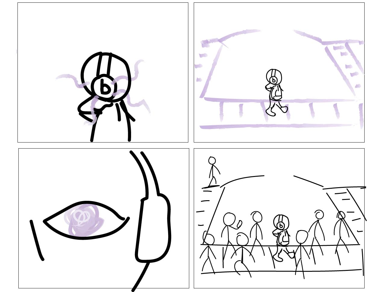 In the following panel, there is another close on the eye of the person that is listening to music. I changed the color of the eye to the same color of their imagination. The reasoning behind this is to find to the reader that everything that is purple in the scene is what the person that is listening to music is envisioning. Then in the final panel of the comic, the reader is finally introduced to reality and views what is going on around the person that is listening to music. The cross walk is crowded with people that are coming and going. Meanwhile the person that is listening to music is lost in their own imagination. The music is isolating them from rest of the crowed, placing them their own imagination. Even though they are still physical present in the crowd of people.