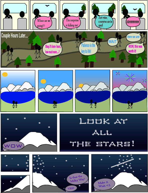 At first glance, this comic looks simple and colorful, with more emphasis on the stars. This was my choice because I love looking up at the stars and imagining what there is beyond them. As per the rest of the comic, it is simple but says a lot, since it is a full day trip with lots of scenery changes. I also tried to change up the framing, rather than making it symmetrical to add a further challenge. This is seen with the 5 small cells followed by one cell with a story throughout the image, and then back to the generic 4 cells and 2 cells (which are also different sizes), followed by that are cells, where one of them is three cells put together to convey one message. Overall, I really tried to learn new tools and push creative boundaries.