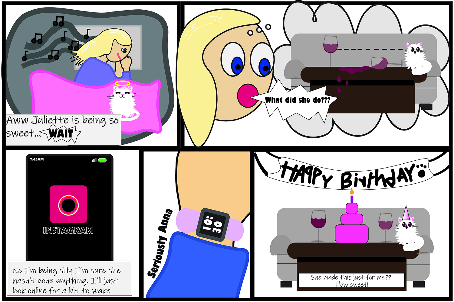 I had a lot of fun with this project! I had started making my comic about a week before we left for quarantine and so I had a pretty good head start. I originally started with the cat on the coffee table looking at the wine. I was not sure where I was going with this idea but I soon figured out that I wanted to incorporate things that had to do with me. Therefore, I used myself and my cat as characters and other things I like, such as wine, Instagram, and my birthday. The way that I expressed my individuality is through my cat throwing me a birthday party. Honestly, she is my best friend that I have at college as well as at home and so we have a close connection. I throw her birthday parties every year and so I thought it would be cute to have her throw me one in my comic. I started with the scene of me waking up and seeing how cute she looked, a daily occurrence, and then I think to myself she only looks this cute when she’s done something. That is normally true and nine times out of ten she has ripped something up or thrown up in the carpet. Everything that I have mentioned before is both my purpose/idea and as well as the form. As for the idiom, I would say that this is most definitely fiction because there is no way for Juliette, my cat, to throw me a birthday party by herself. Next in our reading was, structure, since it was not that important that the reader see me get out of bed that is something that I chose to leave out. I could have added it to add to the frames that I had. However, I felt that it was implied that I got out of bed because there were no thought bubbles around the last frame meaning I was actually looking at, not imagining what I was seeing. for the craft step in McCloud’s book, I spent a ton of time creating the cat because I had to watch hours of youtube videos on how to get that furry effect without drawing individual strokes. this was time-consuming but also really fun to learn so I’m happy I did it. I then took my iPad and drew with my apple pencil the outlines of what I wanted. for example, me waking up in bed I drew on my iPad and then transferred it to adobe illustrator so I could use the curve pen as well as the blob brush to trace over the sketch I had made. I then added way more details than I have been because I really wanted to push myself! Lastly, there is the step of the surface. I think that the biggest thing that people will see when they first get exposed to my work is that this is a fictional story about me. Especially if I were to name the comic “a day in the life of me” or something like that to explain that the comic is about me and my cat. All in all, I am extremely proud of my work for this comic and I am so excited to share what I learned.
