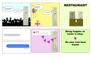 In chapter 7 of McCloud’s Understanding Comics, he discusses the 6 steps to humans motivation for making art, and bringing a comic together. First is the idea. My idea for this comic was to show my individuality. I used a female subject and showed her in her life, at different events where she doesn’t seem happy. She is surrounded by people and fun activities but at the end of the day, she feels happier in a more introverted setting. I wanted to show in this comic that it is okay to spend time alone, and there is value and beauty in time spent with just you and your thoughts. The second step is form; I knew that this would obviously be a comic, and I wanted it to be a chronological story. I wanted it to be digital but have a mixture of physical art as well. I also knew I wanted it to include dialogue and multiple characters. Third is idiom, or genre. I knew this was going to be a realistic fiction type of story. It would somewhat embody my opinions on life. Fourth we have structure. Like I said, I wanted this comic to be chronological and tell a story from left to right, top to bottom. I do enjoy making comics where the order and structure can be up to the viewer’s interpretation, however I felt that in order to get my message across this comic should stay consistently chronological. Step 5 is craft or skill that is used to produce your work. I wanted to try to use my digital skills which worked for some aspects, but I also needed to combine drawings as well. I also feel that this adds to my comic by giving it multiple textures and colors which is unique. The sixth and final step is surface. This is what the initial feel and finish the comic has. I wanted it to be light and easy to read but still have an underlying message and lesson.