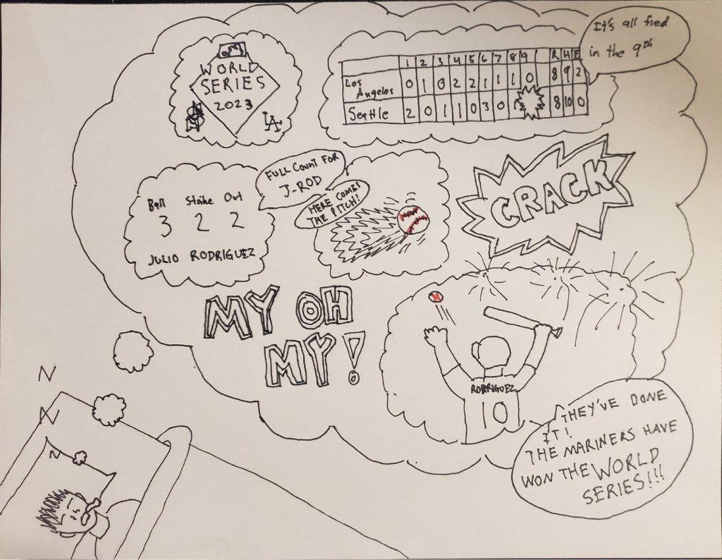 For this week we were asked to express something about our individuality. For my comic I decided to make it about my favorite team, the Seattle Mariners. Something that you should know about the Seattle Mariners first is that they have never won the World Series or have even been to the World Series. For my comic I had the idea of it being a dream. I had this idea in my head for a long time, but I did not know what my dream would be about. I decided to make the dream about the Mariners winning the World Series. I had to pick a team they would be playing so I chose the LA Dodgers of the National League. I chose the year 2023 because we are currently in a rebuild process so I thought that maybe they could be a good team again in the 2023 season. I chose Julio Rodriguez who is one of our best prospects in the minor leagues right now. He is a young player that is very talented so I thought him hitting the walk off home run would be fitting. For the form of this comic is within a dream. I chose this form because I thought it was an interesting concept that you do not see all the time. I thought that it will add more to the representation I am trying to portray because it is something that I want to happen, thus being a dream. I think the way I used the frames as clouds as well as adding words and actions outside of the frames helped a lot to this comic. I like when comics are kind of wild and you have to try hard to follow the path, they want you to follow. It is a normal path you would think you are following in comics but with twists throughout. Some of the styles and gesture I used were in the text. I used normal text for a lot of the comic. I tried to implement logos and things in the ballpark that mattered to the idea. I like when comics have big action words, so I used CRACK and MY OH MY in the comic. The CRACK is the sound of the bat after he hits a home run. I used the famous quote, “MY OH MY,” from the late announcer of the Mariners, Dave Niehaus. Dave Niehaus is not alive anymore, but his most famous quote is when he would say MY OH MY after something amazing. This also adds to the dream aspect because maybe in my dream Dave Niehaus is the commentator. When I was putting it all together, I decided to use the logo for the world series, the scoreboard, the count, and the view of the batter hitting the home run. I think these are the perfect things to show what is going on in the comic. I wanted to show that it was the World series, so I used the logo. I wanted to show that it was a tie ballgame, so I showed the scoreboard. I wanted to give suspense, so I used a full count on Julio Rodriguez and showed that. I think all the parts I used came together perfectly. The tools I used for this comic are sharpies, pencil, and a little bit of red marker. I wanted to use the red marker because I used it in my previous two comics so I thought I would keep the trend going and they worked with he laces on the baseball. This comic is more ambitious than the others to me because there is a lot more going on and it makes it a challenge for the reader. I wanted to make this comic a little chaotic with a lot of things for the reader to think about. I used multiple frames and also text that went outside of the frames to make it look chaotic since the story it was portraying is so exciting. The conclusion of this comic is that it was all just a dream yet there was so much that made it feel real.