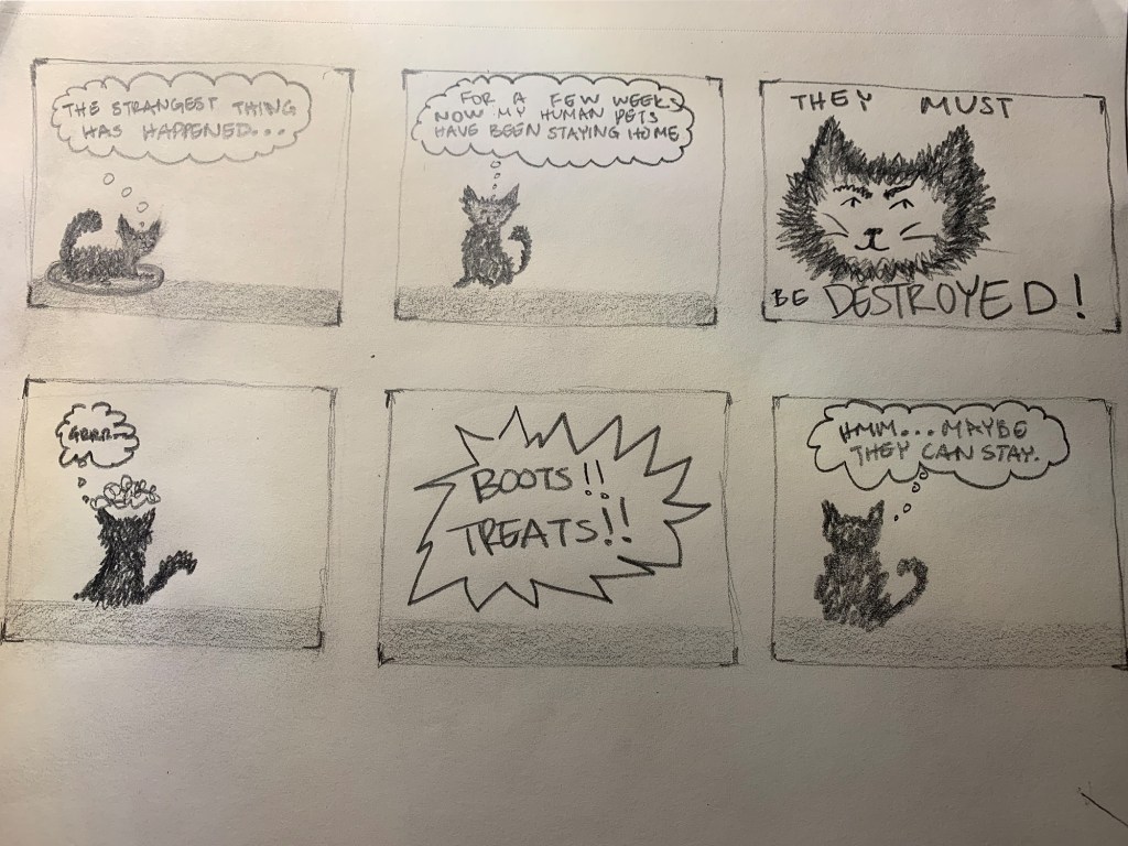 In my final blog post my goal was to create a story based off the perspective of my cat that I have. I figured that while the world around us has changed so much, our animals must be wondering why we have been home so much more often. Are they happy? Or perhaps, like from the perspective of my comic, they wish to be alone again and go back to their daily schedule. I can only imagine my cat’s earlier days consisted of many naps and peace and quiet. Now, it is very far from that. The form that my comic took was all about my fluffy gray cat I have at home, I made sure to give it more detail than simply drawing a stick figure looking cat and do my best to show facial expression or little clouds above her head when angry. For the idiom, my style takes on that of a fairly normal comic style, I relied on thought bubbles and added the jagged lines around the words that were being yelled so it would have more emphasis to it. The comic is all in black and white. In my structure I made it all to the cats perspective so I did not want to add any more members of my family or I into the comic itself as to put more focus onto my cat and the story she was supposed to be telling on her own. During the drawing process my craft came from simply a graphite pencil and paper, I was able to shade darker or lighter to add depth to what I was creating. My surface was lastly added by cleaning up my edges to each box, adding shading to the ground area and adding in my wording that fit with each frame. I wanted my six -stage story to have closure at the end and even make it a bit comical to bring some light into what is happing in the world right now. This comic was more ambitious than my last few comics I think because of the storyline I created. I definitely wanted it to be more in depth and comic like than any past comic I had done. Maybe even be a little witty. I thought of what I wanted to tell in my comic then drew the images around that idea. I added emotion and drawing style to show what my cat was feeling within each frame. I intended to do the thought bubbles because for some reason I have always thought that cats have this inner monologue that they are always saying. I thought it would be funny to flip the roles and have the humans as the pets in this situation and the cat as the leader of the house. Imagining herself as the queen of the household. The story ended with my cat getting some treats, and realizing that if she did destroy us, she would no longer get treats like this handed to her and she would rather have to work for them on her own.