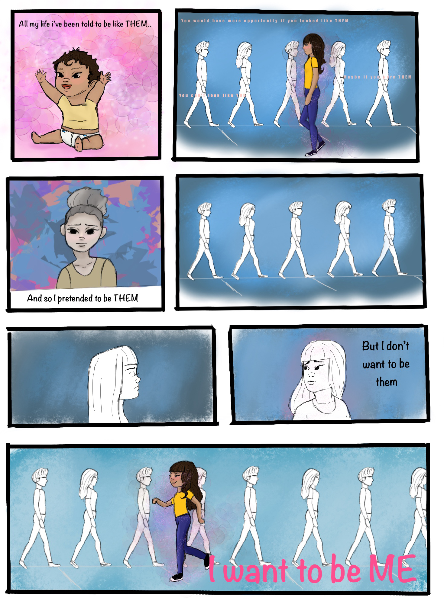 The idea / purpose of this comic was inspired by this reading that I had in my Chicano/a studies class. The reading was about how some young latinos struggle with their identity. This really resonated with me because, growing up I was always judged by my looks and race, making me feel forced to confirm to Western / European beauty standards.