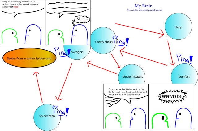 This was more ambitious than my previous comics for one reason, structure. For the most part I like to make linear and easy to follow comics as I have done for almost every comic this semester. With this comic I tried to make it a little more than just a linear comic through adding the free form thought process in the middle. This is a break from the linear storytelling of the panels as it pulls you away from the characters and instead brings you instead to follow my thoughts before returning to the characters. The middle section also breaks the panels in half making time seem to pass differently through the middle section. In all of the panels time seems to be passing at the same speed as it is a conversation however for the thought process or middle part it is faster. I chose to demonstrate my thought process as pinball because it seems really random and travels quickly with an erratic path. This middle section makes the comic a little more complicated as it makes it not just linear but also with the internal workings of one of the characters within the comic. This is more complex than my previous comics which were all linear.
