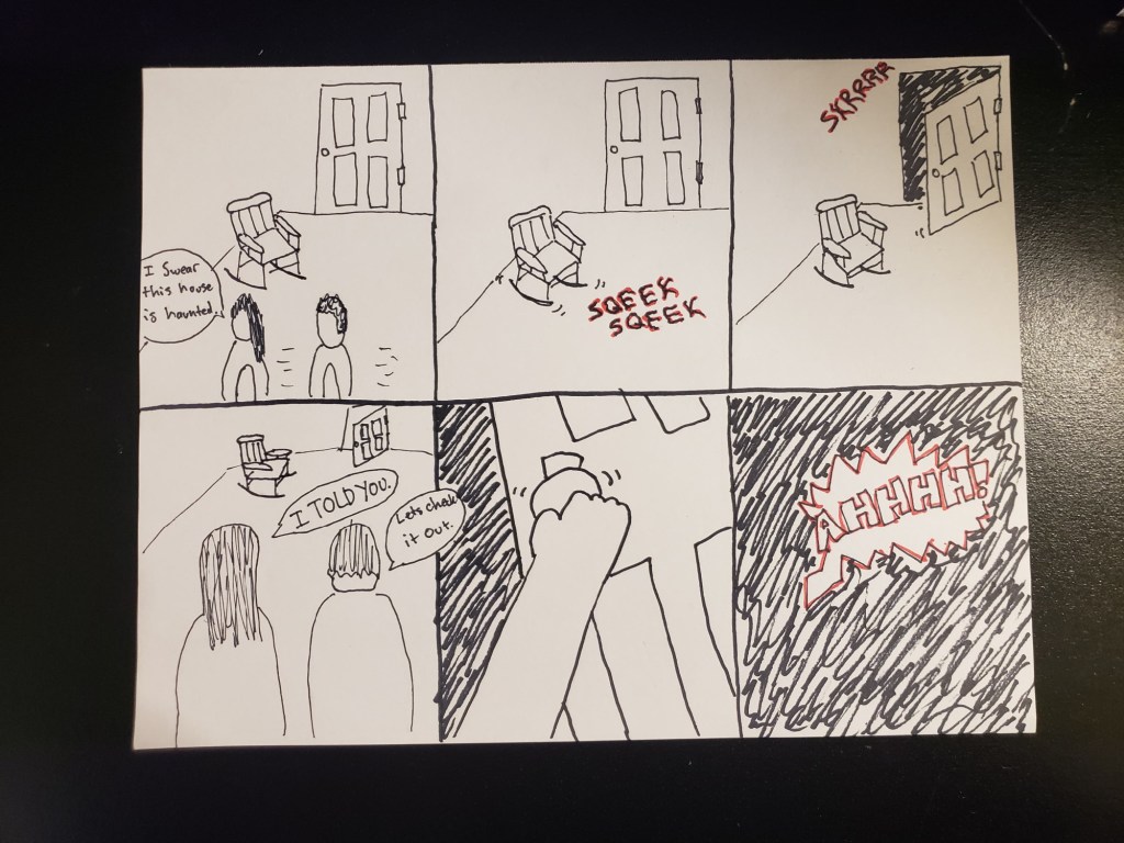 For this week’s comic I had a hard time trying to figure out what to draw. I decided to go with a scary theme and thought of the classic horror movie scenes in movies. I picked a scary basement door and rocking chair as my main subjects because a scary movie isn’t complete without either of these. I used independent word-picture combinations int he first and forth frames. In the first frame these two people are walking into the house and the women says she thinks the house is haunted. This starts the comic because it tells you what the comic will be about. The next frame shows the rocking chair squeaking in a creepy crawly font. The same thing then happens to the door and the couple get freaked out. They then decide to check it out because it is a scary movie theme and that is just what they do in scary movies. When they investigated the open basement door all you hear is a scream. This way I left the ending of the comic up to interpretation for the reader. I like when comics and movies do this but at the same time, I want to know what happens. This all depends on your imagination.